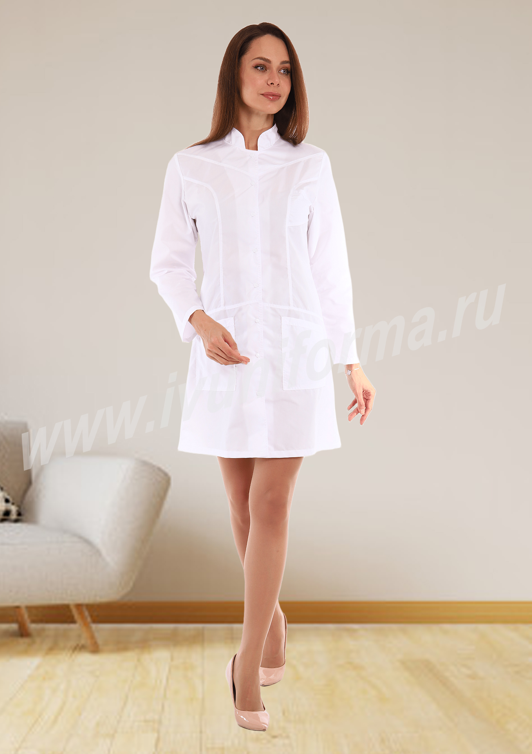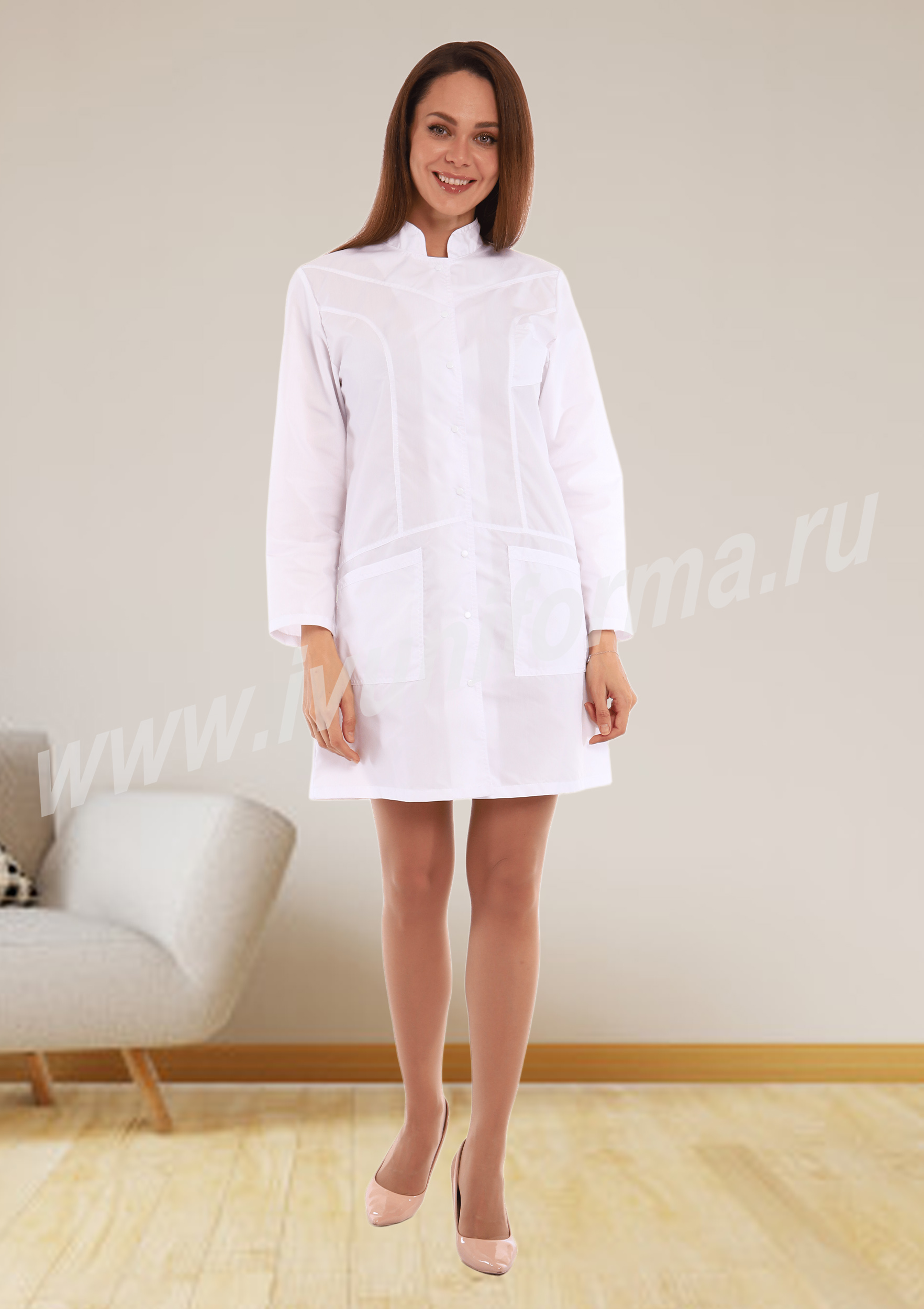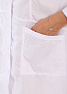Халат женский средней длины, прилегающего силуэта с центральной бортовой застежкой на кнопки. Полочка с эффектной отрезной баской и рельефами с декоративной двойной строчкой. В нижней части полочек расположены нижние накладные карманы, в верхней части небольшой нагрудный карман для мелочей. Воротник-стойка придает изделию элегантность, а длинный втачной рукав практичность и комфорт. Спинка с рельефными швами и хлястиком в центральной части выгодно подчеркивают талию. Геометричность линий, отстрочки и подрезы делают образ строгим, но в то же время женственным и романтичны. Халат выполнен из легкой смесовой ткани, прост в уходе, предназначен для медицинских работников и персонала СПА салонов.