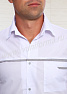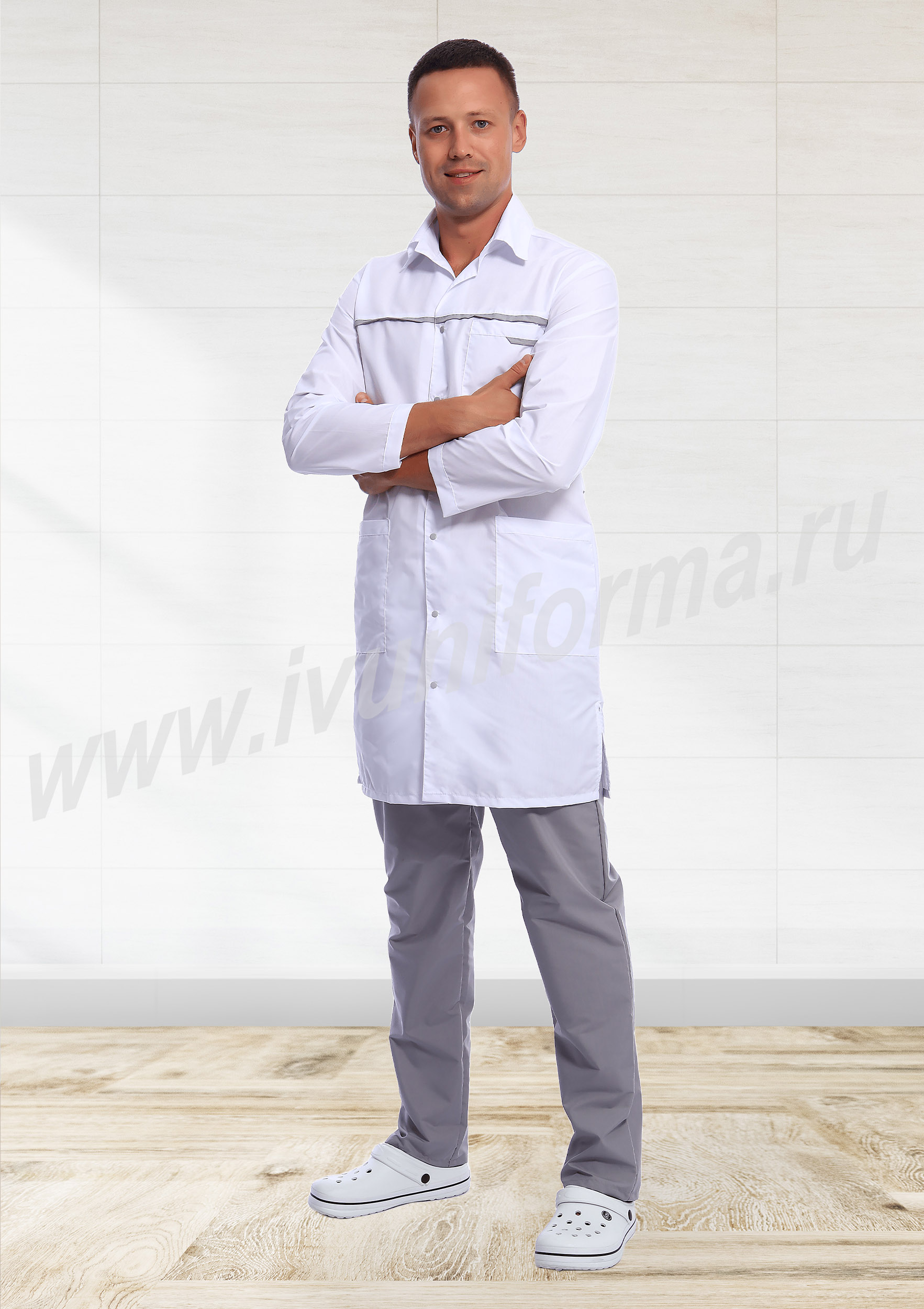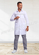Халат мужской прямого силуэта средней длины с центральной бортовой застежкой на кнопки. Полочки с отрезными кокетками, декорированными отделочным материалом, вместительными накладными карманами в нижней части и нагрудным карманом с отделкой из контрастного материала на левой полочке. Спинка с отрезной кокеткой и средним швом. Объем по линии талии регулируется полупоясами с фиксацией на кнопки. Воротник классический. Рукав втачной длинный. В боковых швах халата предусмотрены разрезы, обеспечивающие свободу движений. Халат прост в уходе, практичен и удобен, предназначен для медицинских работников.
